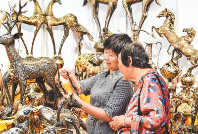 9月23日,在廣西南寧舉行的第十六屆中國—東盟博覽會上,“一帶一路”相關國家的參展商帶來的商品吸引眾多參觀者前來選購。圖為參觀者在南寧國際會展中心選購巴基斯坦青銅器。新華社記者 曹祎銘 攝