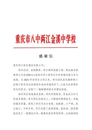 近日,兩江建設公司收到兩江金溪中學關于兩江八中(即O38-1-1地塊中學工程)移交使用的感謝信。