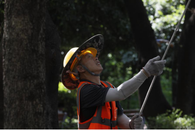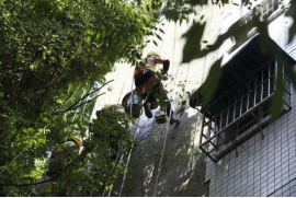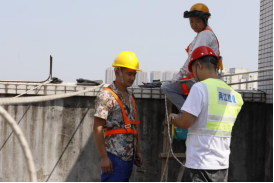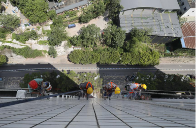 10:16,另一棟樓的天臺,經過連日的高溫烘烤,難得的庇蔭處也燥熱難耐。安全監督員小陳仔細檢查每一條承重吊繩的卡扣是否牢固,反復測試安全鎖的鎖止力度。他介紹到,“高溫會加速金屬部件氧化,每一個卡扣都可能成為生命線的關鍵節點!辈贿h處,老趙踩著木梯微微前傾,將電鎬穩穩遞向空中,小費伸手接過時,手柄上早已覆上一層細密的汗珠。兩人的目光在高差中交換,像是完成了一個無需言說的暗號。全員互道“就緒”的話音剛落,“蜘蛛人”小分隊便抓牢繩索,伴著輕微的滑輪轉動聲緩緩下降,正式開啟他們今天的第二輪作業。